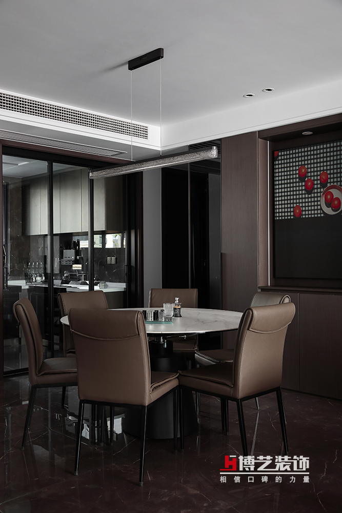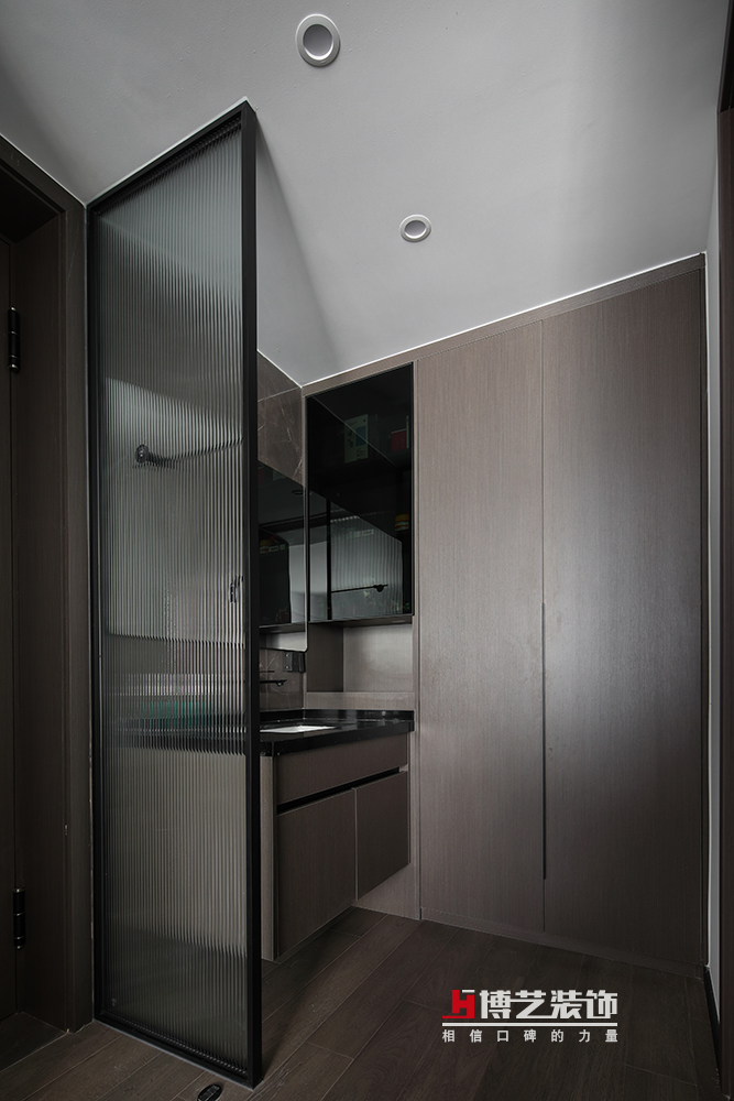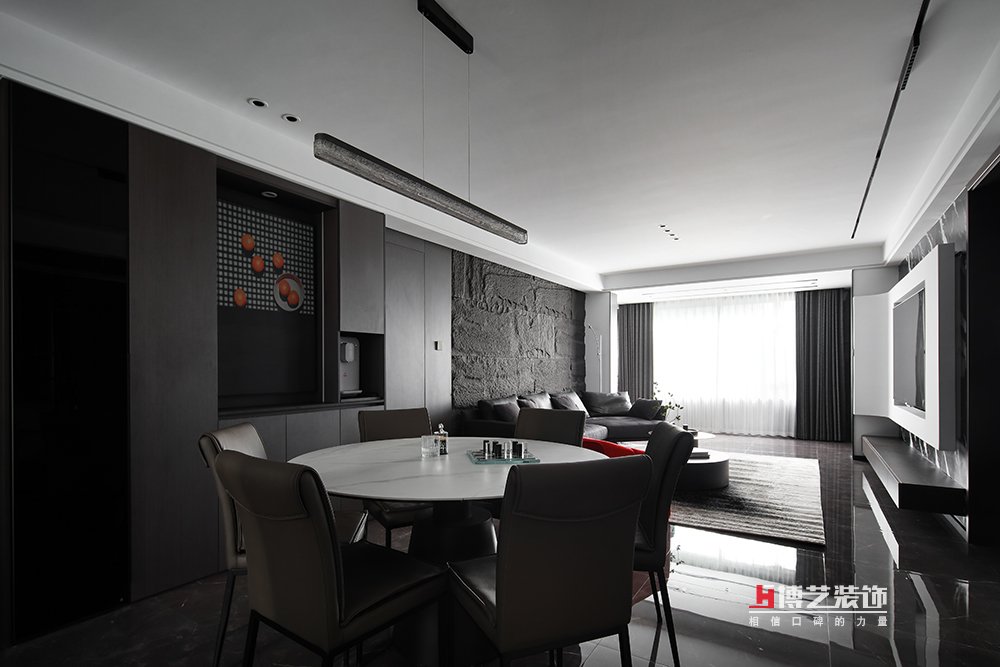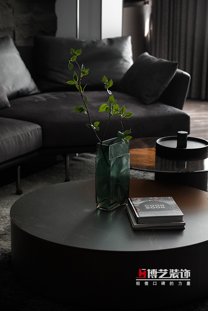 整個色調選用炫酷,個性的暗黑系為主色調,將整個黑色系大膽地從地面延生到墻面,深色調的安靜包容與輕奢高冷在這里展現的淋漓盡致。