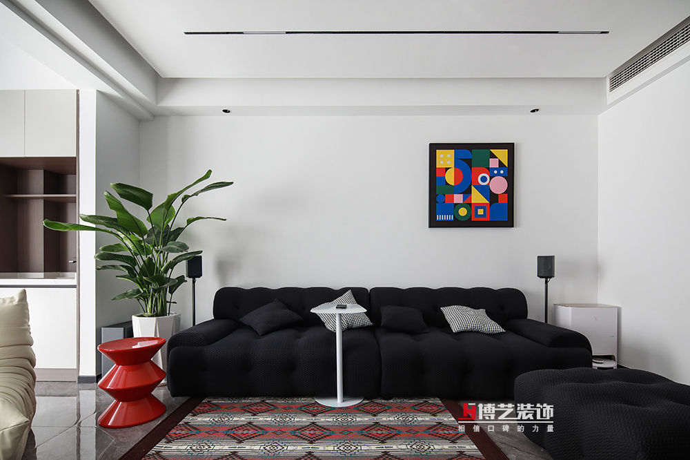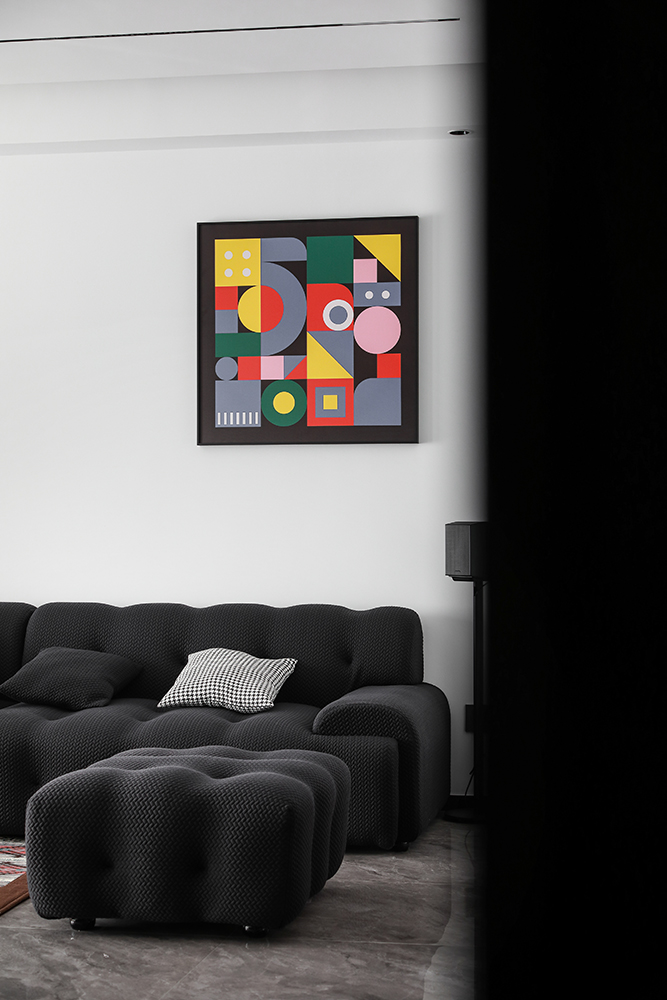 黑白灰的配色,讓空間干凈純凈,去客廳化的設(shè)計(jì),舒適寬敞。在軟裝上加入適當(dāng)?shù)纳首プ⊙矍颍c(diǎn)綴生活。