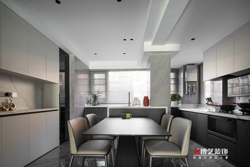 餐廚一體的設(shè)計(jì)讓餐廚空間更加明朗,中間增加了水吧臺(tái),讓下廚時(shí)光更加愉悅,家人之間的互動(dòng)性也更強(qiáng)。