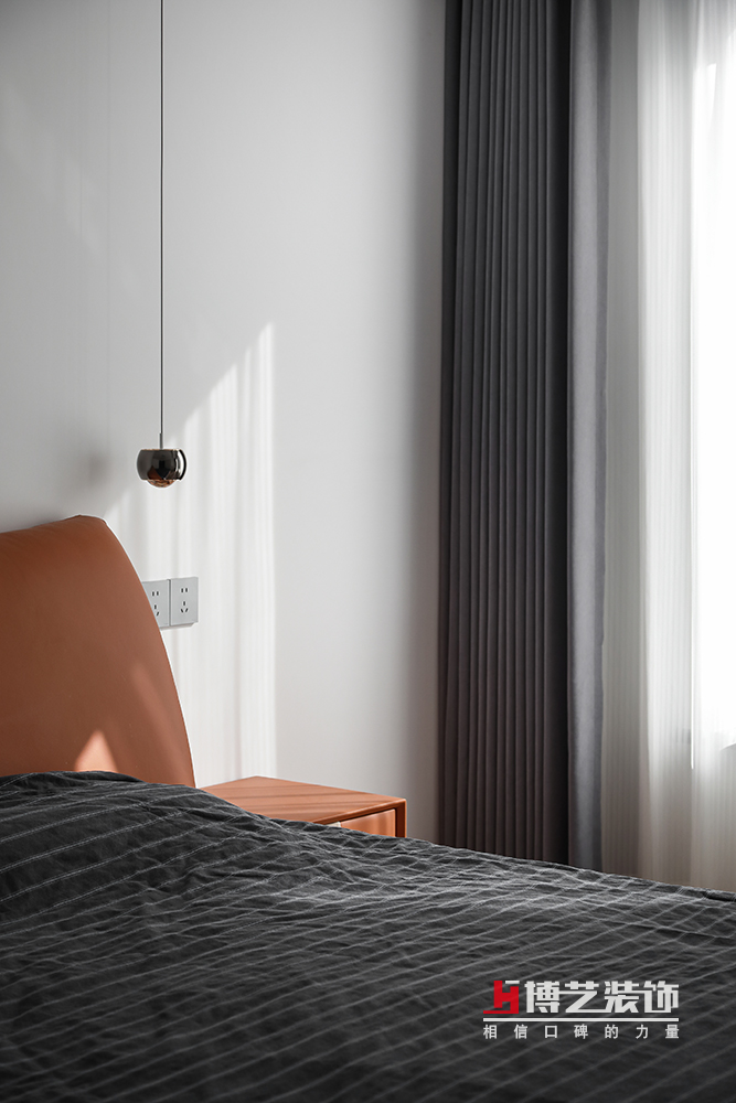 為了增加主臥洗浴空間的舒適度,我們讓出了部分主臥的空間,導(dǎo)致主臥橫向空間有限。我們?cè)跈M向空間有限的情況下,就縱向索取空間。在床位我們?cè)O(shè)置了化妝臺(tái)和衣柜,并與進(jìn)門(mén)衣帽間形成整體,讓整個(gè)主臥空間舒適實(shí)用。