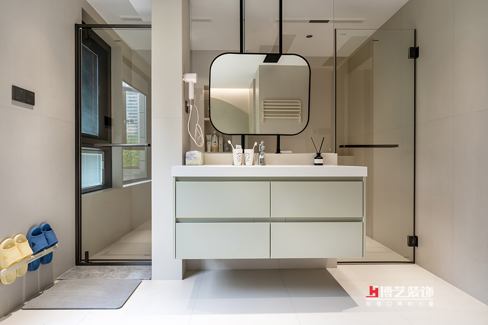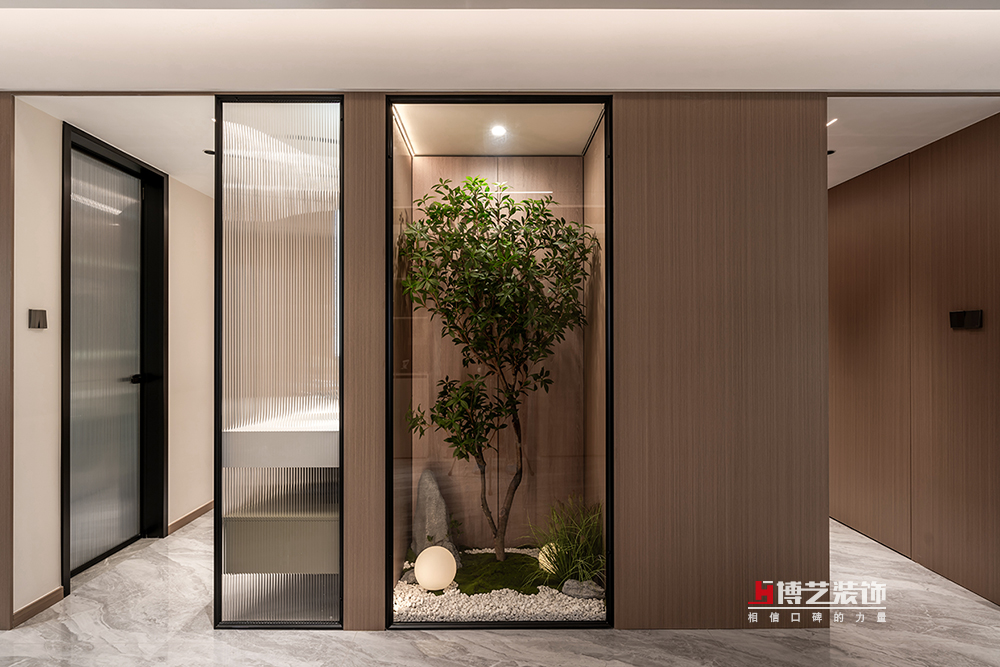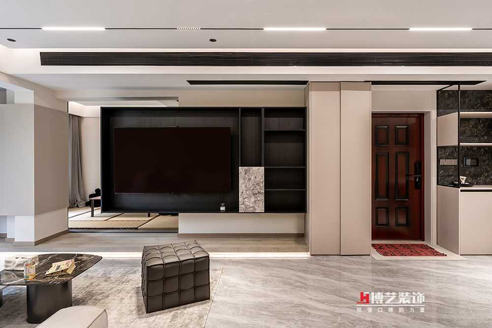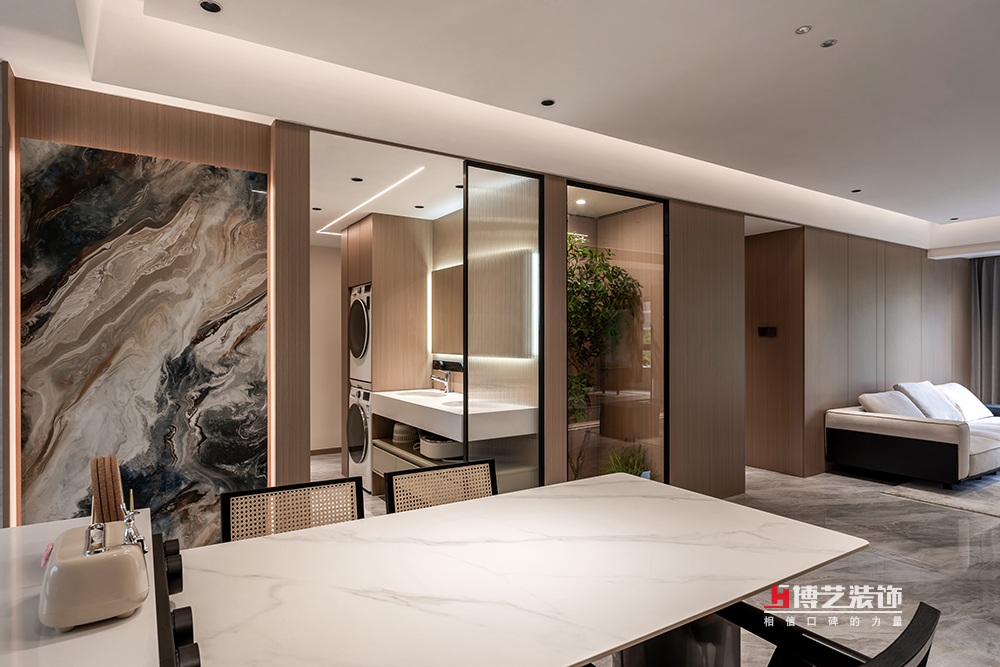 房屋的中心線上做玄關造型,開門第一眼的“風景”。圍繞玄關將裝飾柜,洗衣區,衛生間干區集合形成第一條洄游動線,利用空間再做一個儲物間,滿足收納和生活所需。