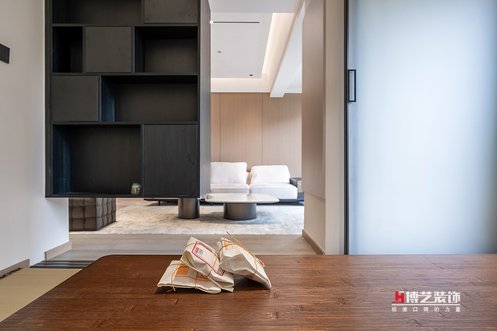 因為喜歡與好友相聚,所以設計了一間茶室。以榻榻米的形式呈現,與客廳互通,可封閉可開放,未來也可成為孩子的游戲場所及親子區。