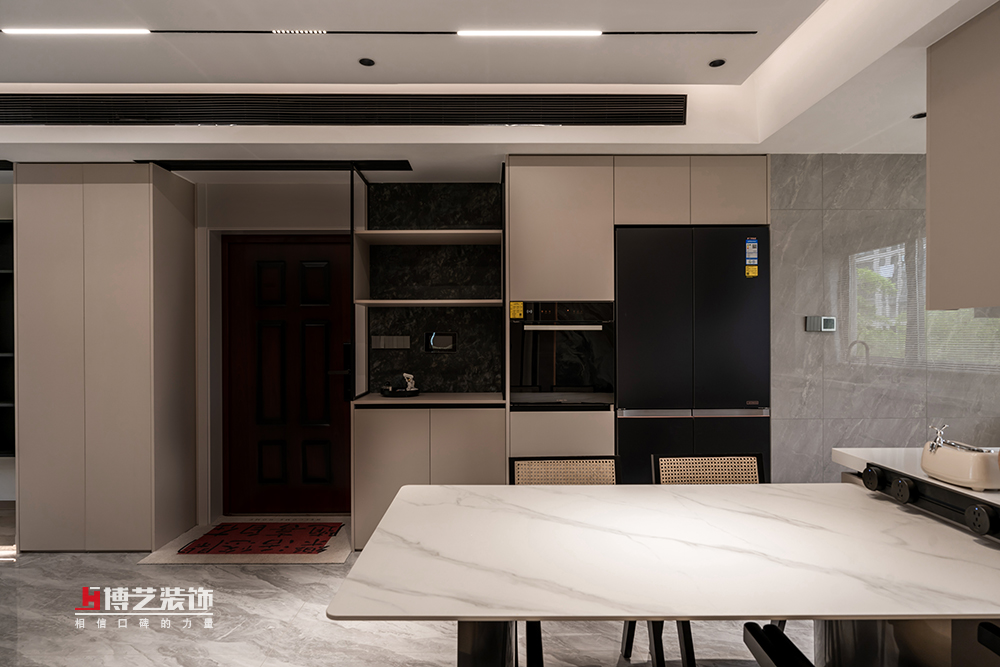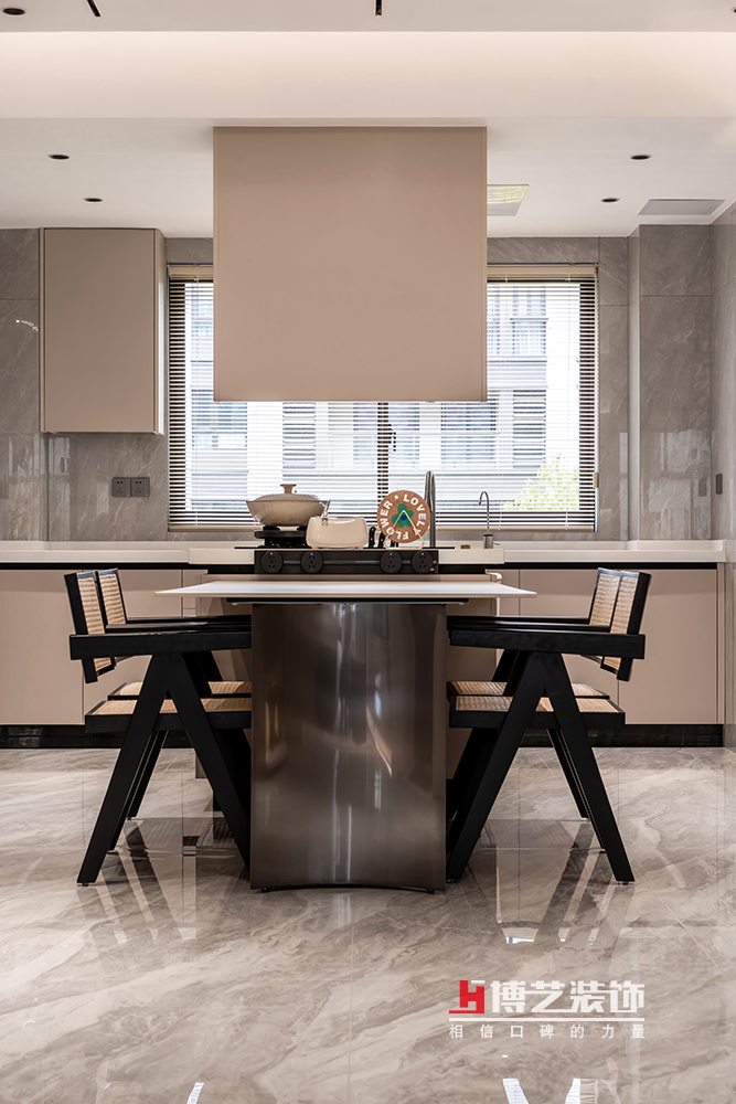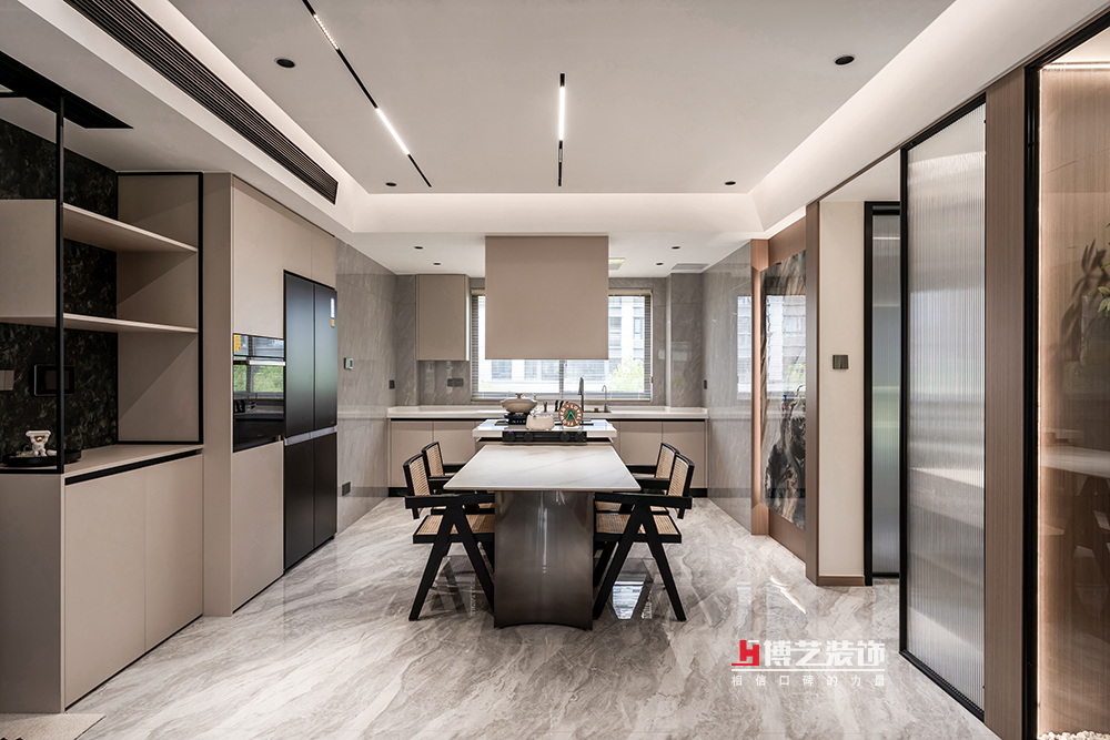 設備平臺打通做餐廚區,將空間縱向延伸,北邊較好的自然光也讓整個餐廚空間明亮開闊。把煙機灶具安放在導臺位置,洗切炒放,一氣呵成。餐邊柜與西廚結合,開放式的設計形成全屋的第二條洄游動線。