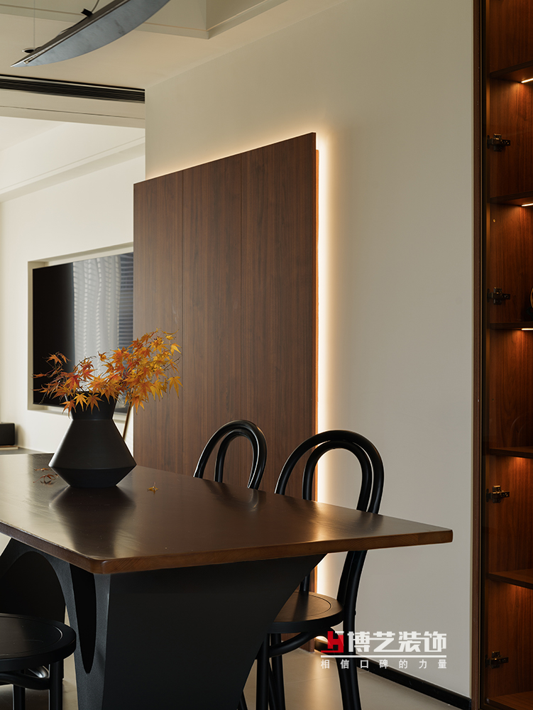 整個(gè)餐廳空間以暖白色為基調(diào),溫暖的胡桃木勾勒出溫馨的就餐氛圍,摩登和復(fù)古在此碰撞出時(shí)髦的火花。幾枝紅楓仿佛在不經(jīng)意間就完成了自然與人文的對(duì)話。