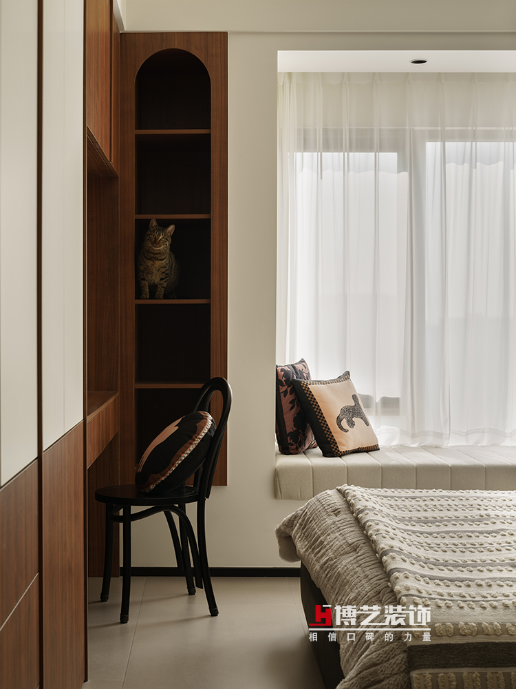 相對(duì)整個(gè)公區(qū)的絕對(duì)開放,這里則是主人另一方私密領(lǐng)域。保留了飄窗,墊上了墊子就成了主臥里的一個(gè)休閑空間。床頭衣柜的位置為女主人保留了梳妝臺(tái),同時(shí)也可做簡(jiǎn)單的工作學(xué)習(xí),讓一個(gè)空間承載了多種功能。復(fù)古中帶著簡(jiǎn)約,光通過紗緩緩地照進(jìn)屋子,讓個(gè)空間呈現(xiàn)了別樣的溫暖。