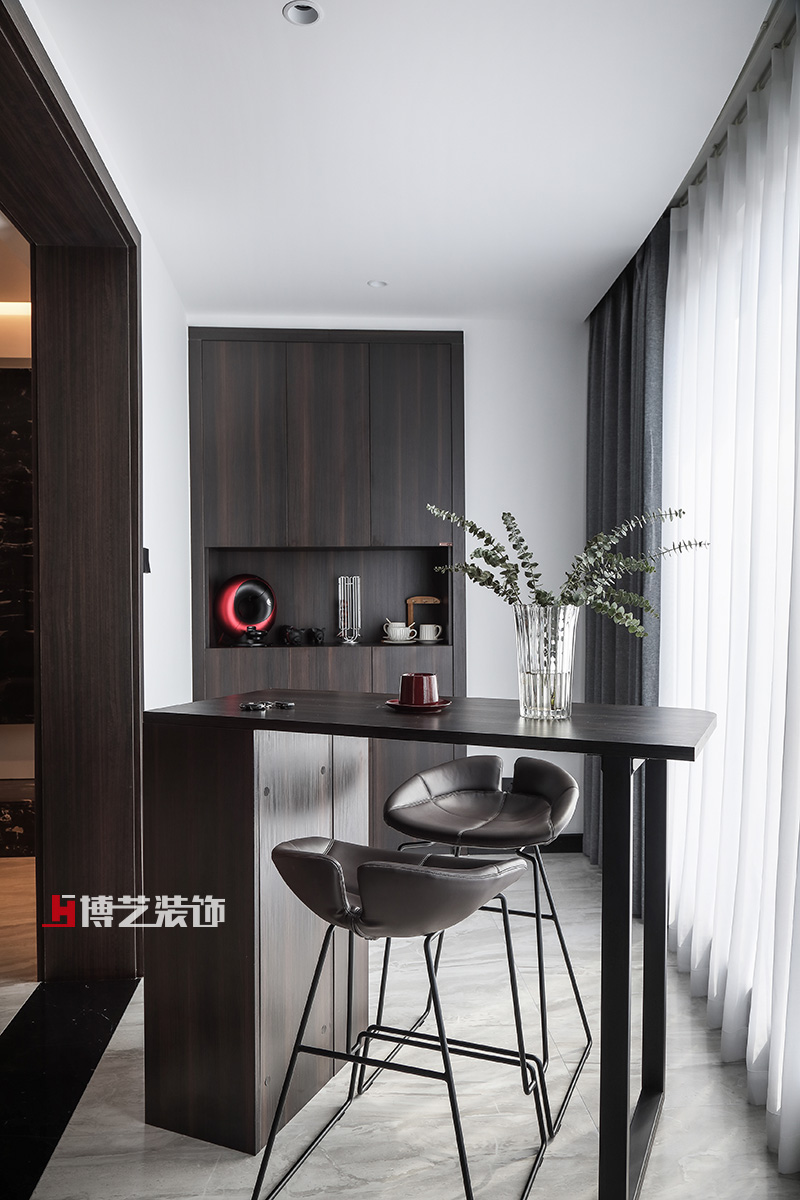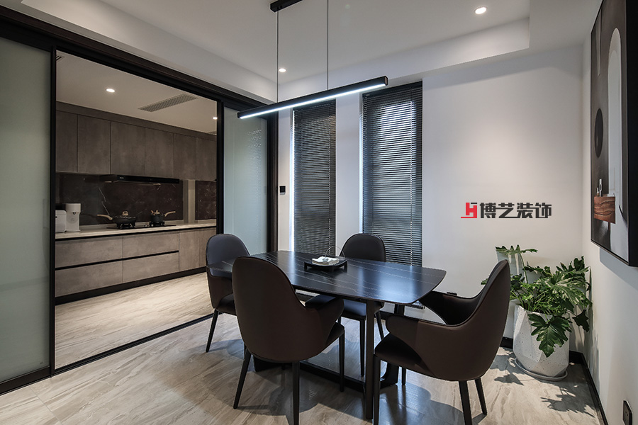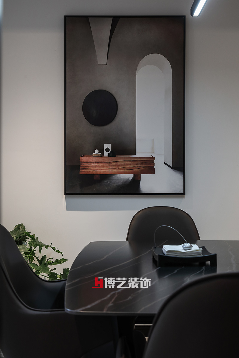 兩扇落地窗保證了餐廳充足的光線,就餐時的心情也會不自覺的明媚起來。黑色大理石餐桌讓空間變得沉穩,綠植的裝飾又增添了一份生機。