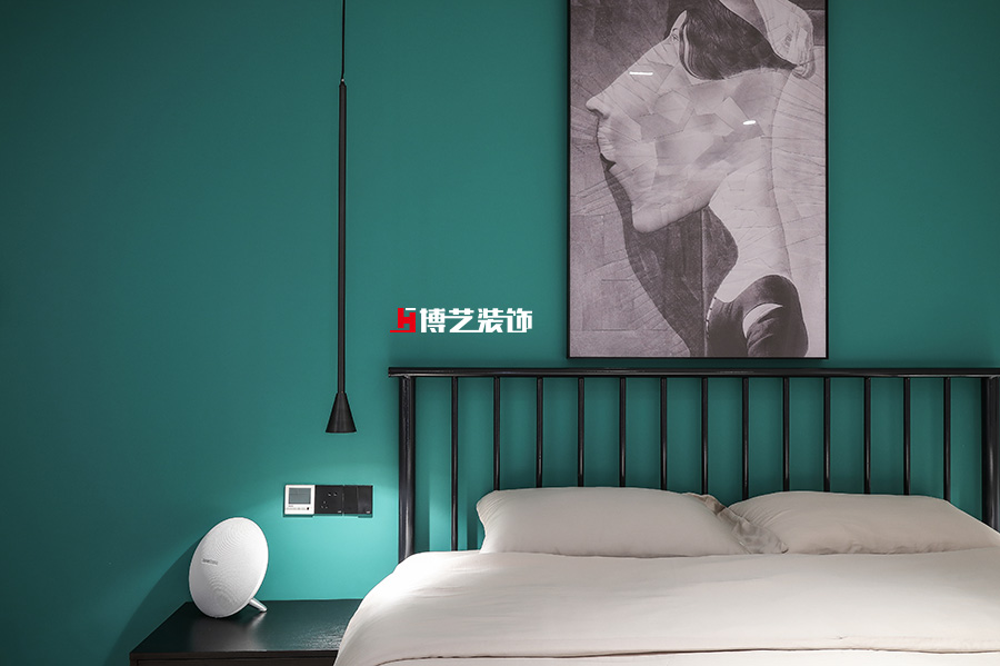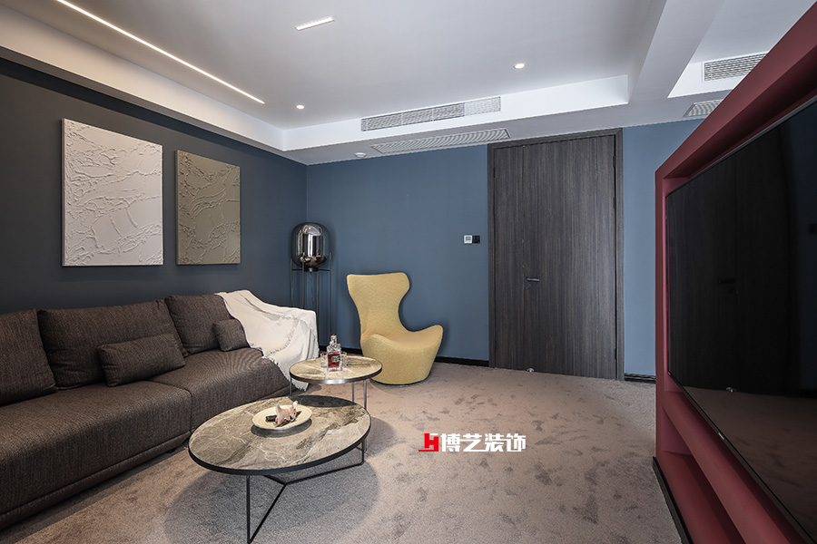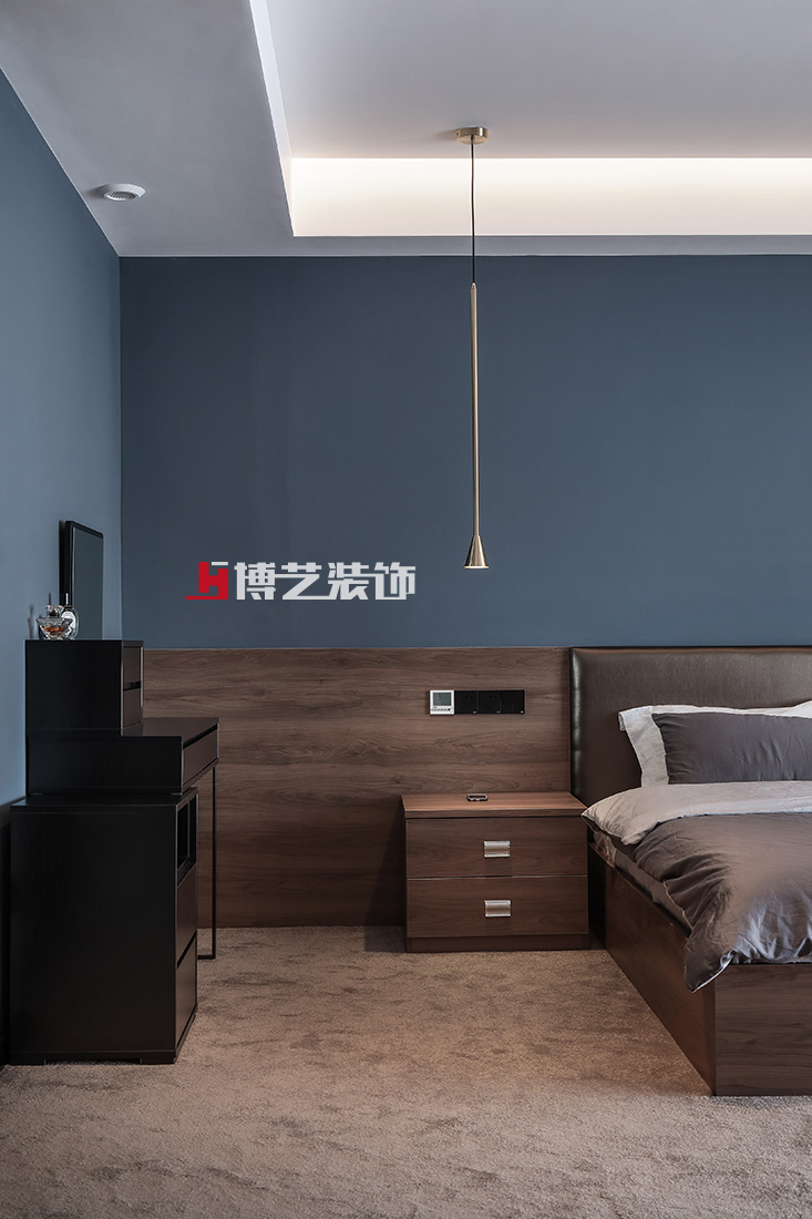 臥室采用藍灰色墻面,搭配棕色木飾面與地毯,軟硬結合,彰顯主人氣質。紅色電視隔斷又調整了空間的亮度,搭配簡單的軟裝,不繁瑣,不簡單。