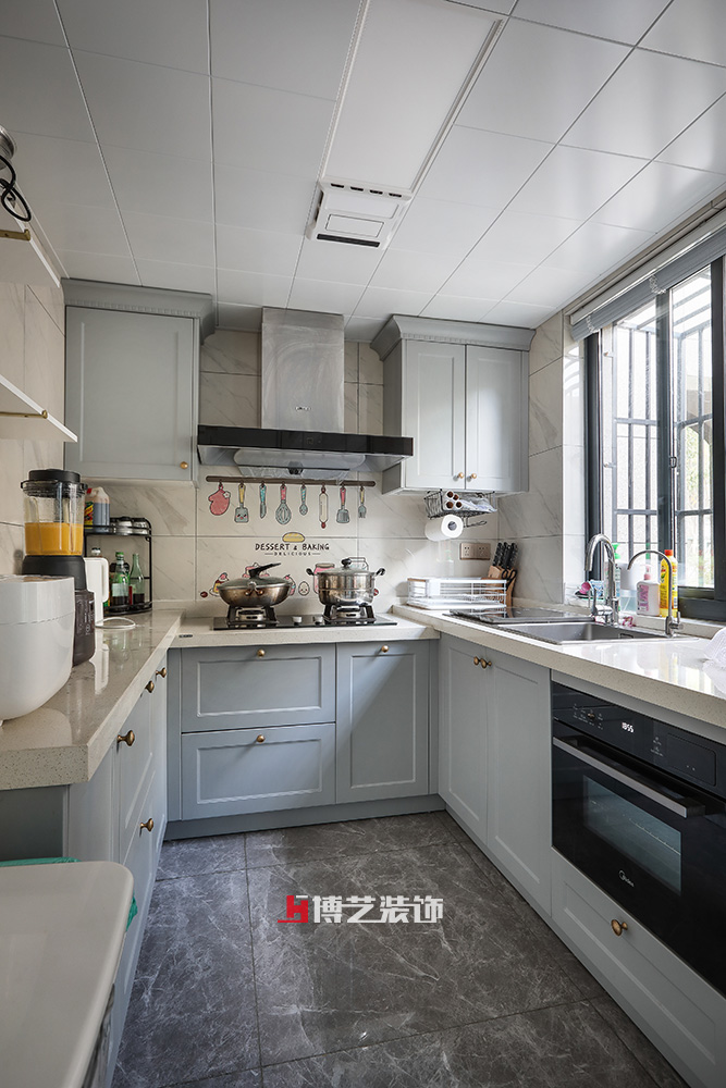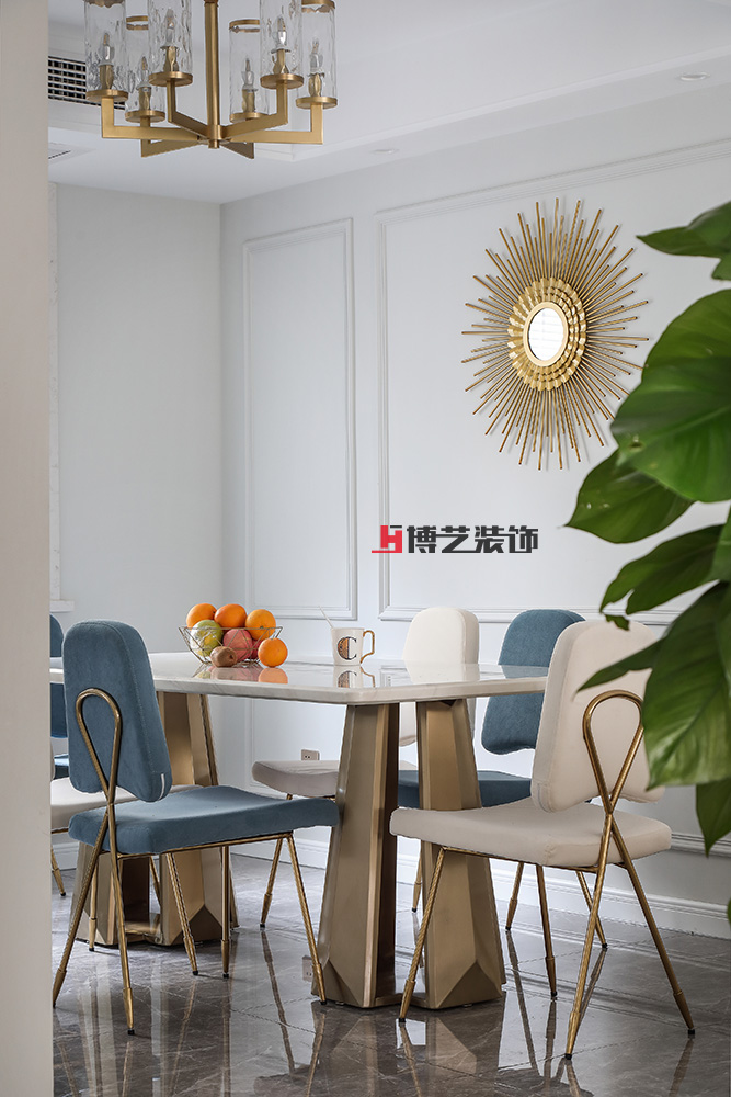 餐桌選用大理石紋桌面,金屬與石材的質感碰撞,搭配藍色桌椅,讓人感覺眼前一亮。