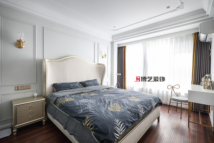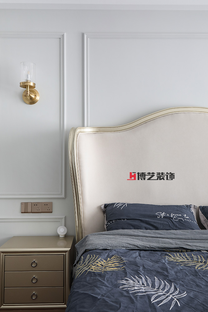 臥室的設計依舊以簡潔為主,去掉過多的裝飾,用莫蘭迪的淺灰色鋪展臥室的柔軟與溫馨。