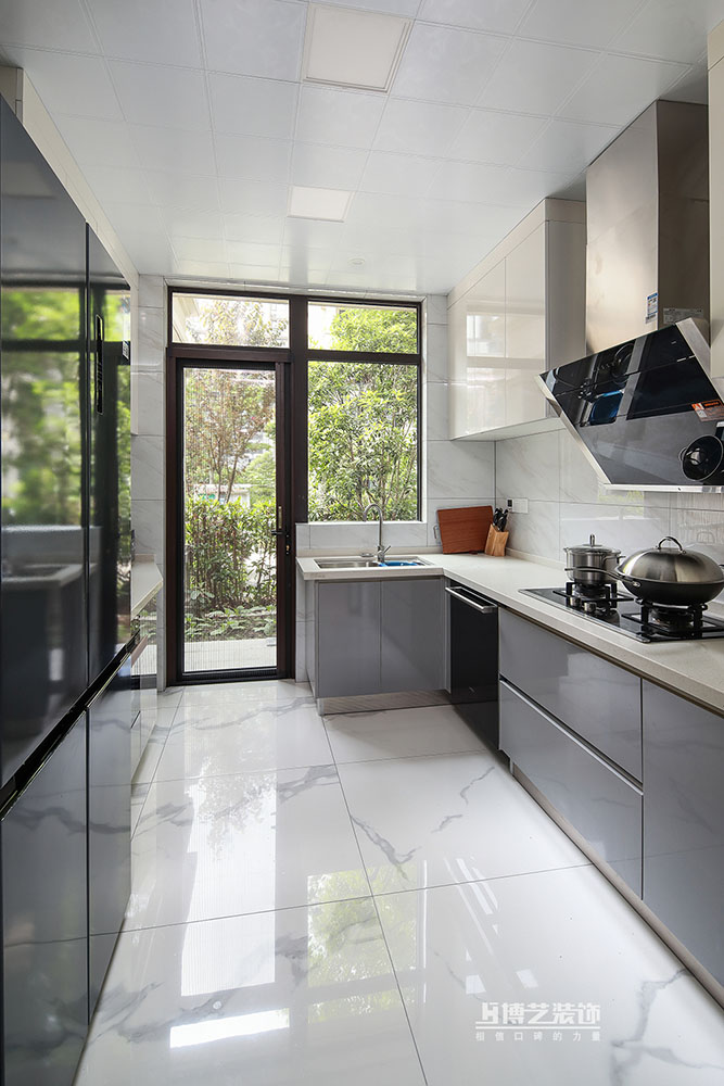 一樓主要是生活區域,包括廚房、客餐廳等。設計師利用北面陽臺的區域,把廚房做后移,整個空間就形成了現在的南北通透的設計,痛風性更好,同時自然光也能更多的進入空間。