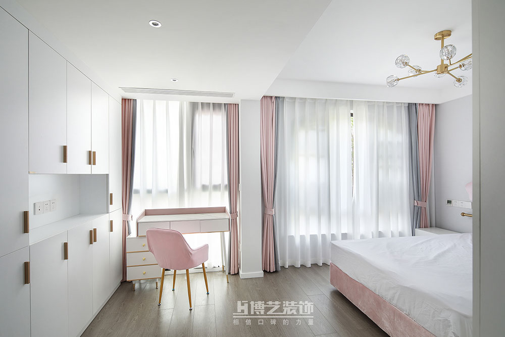 二樓主要是業主的休息區域,臥室都在這一層。把北面的儲藏室與房間打通,作為女兒學習與休息的地方,外衛做干濕分離,提高空間的使用率。