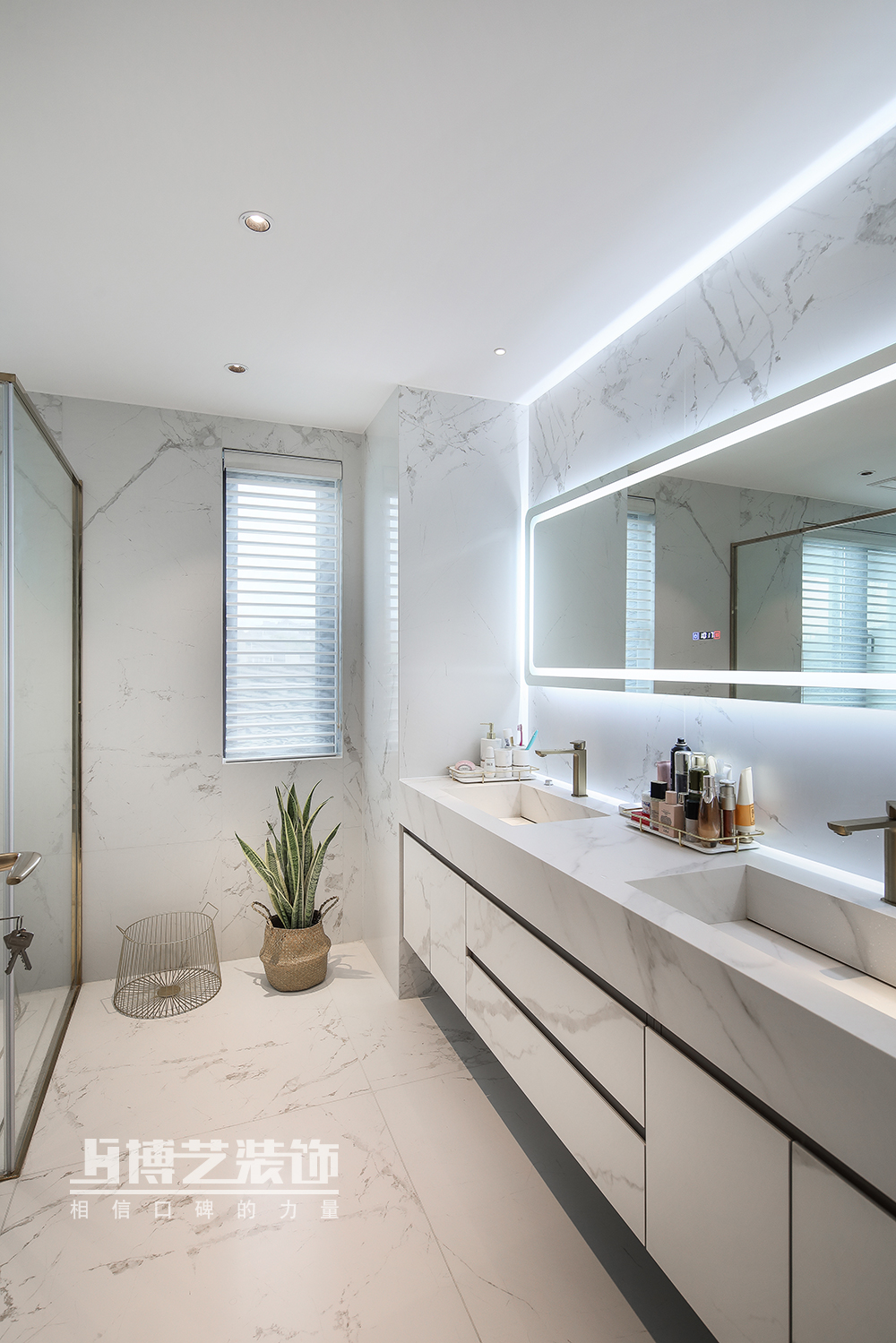 主衛與臥室保持一樣的基調,白色大理石與金屬清冽的鋪展,讓衛浴間極具高級感。