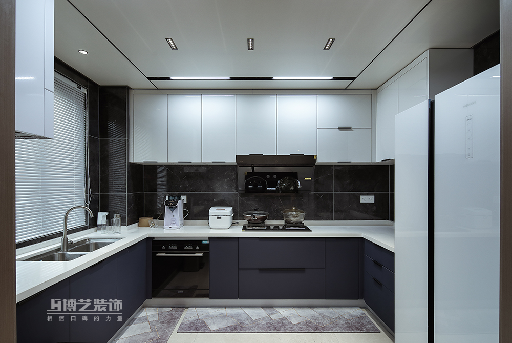 廚房改掉傳統集成吊頂,采用大板吊頂嵌入線性燈光,提升顏值,色彩上與西廚一致形成里外呼應。