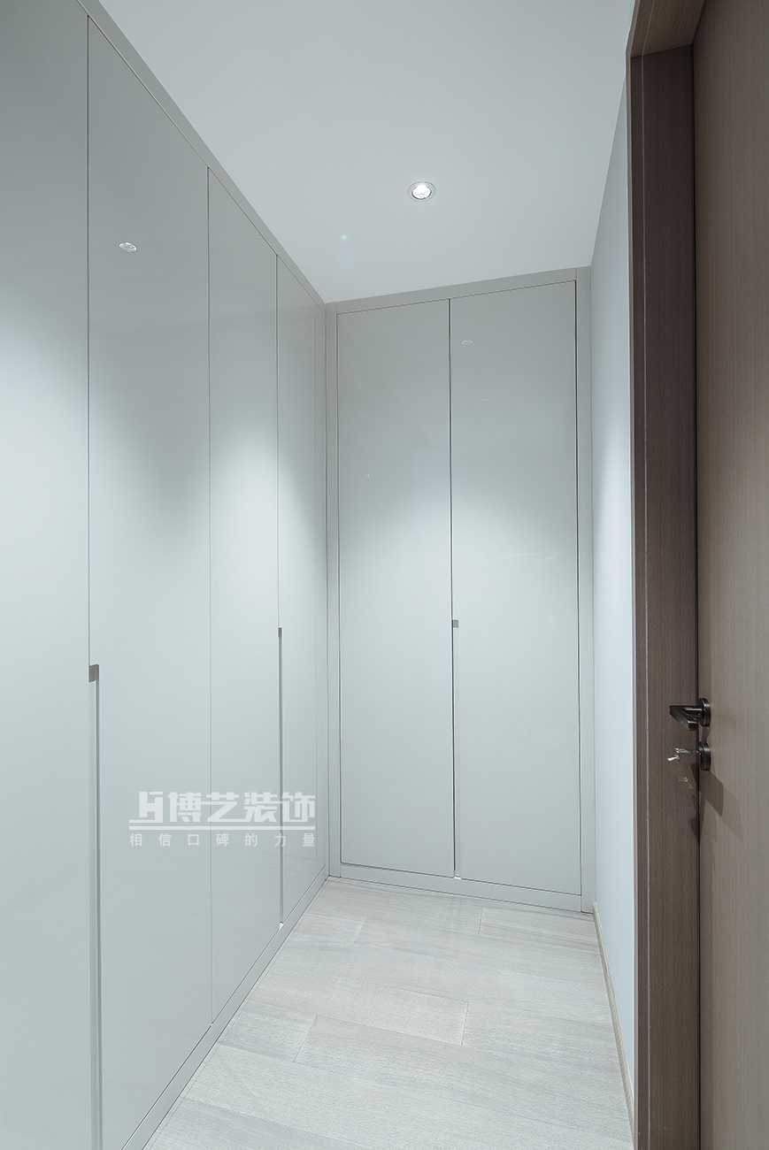 利用主臥門口的公共區域設計入門對景,增加收納同時增加主臥的私密性;主臥墻面用簡單的涂料提升視覺感官,兩邊的燈光提供臥室溫馨的氛圍。