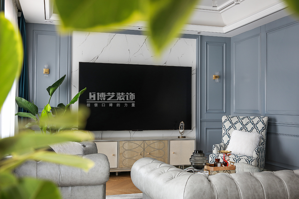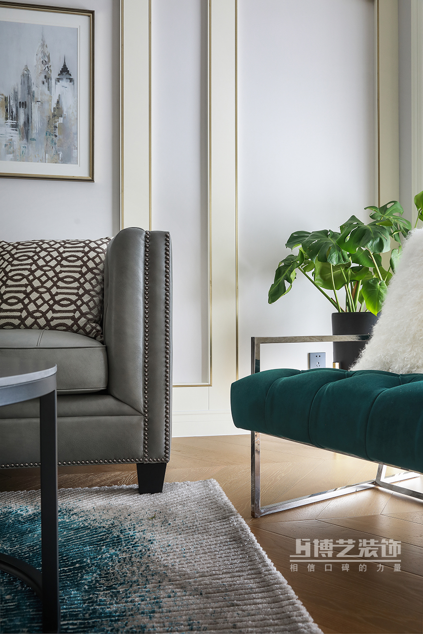 水洗皮的灰色沙發,搭配藍白大花單椅,舒服的色系搭配,清爽大氣更添一份家的溫馨感,精致的軟裝陳設,提升整體的品質感。