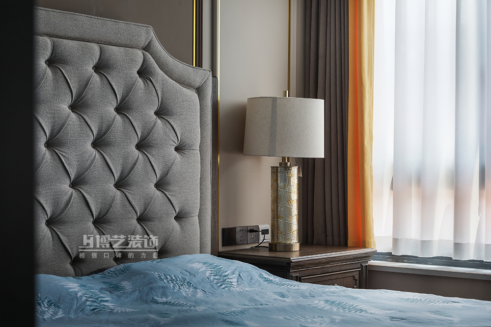 一樓的老人房,簡潔素雅,以不同飽和度的咖啡色營造安靜而放松的睡眠氛圍,添加的金屬線條,在光的作用下,泛著流光,提升空間品質。