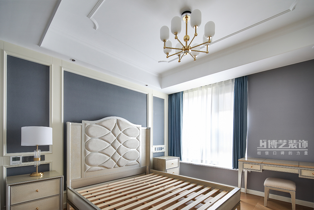 拼色的背景墻往外舒展,延伸視覺,澄凈的藍色與白色搭配,塑造美好素靜的居室氛圍,木質的床頭增添了幾分質樸的氣息,安靜的感覺不斷擴散。