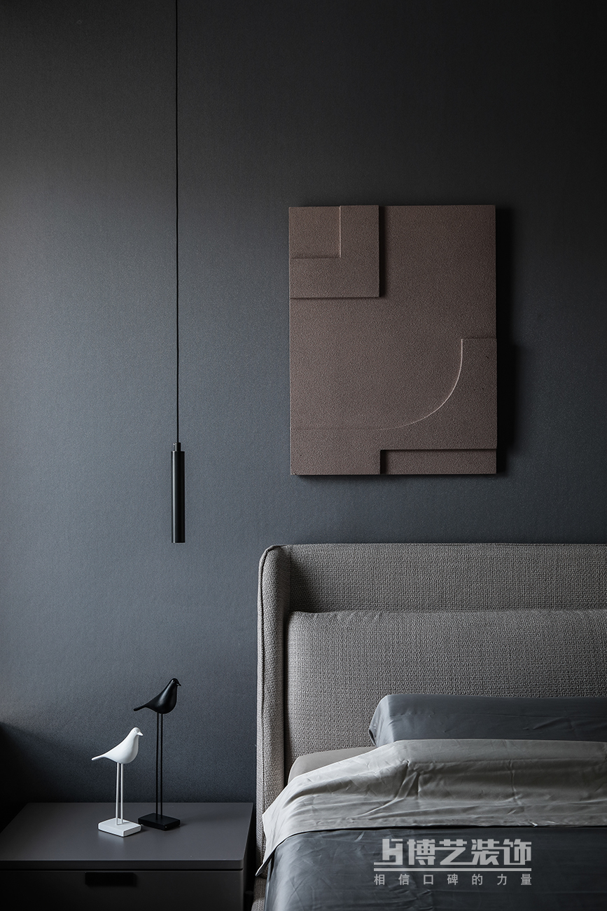 八十度的灰色,靜謐深邃卻也慵懶自得,淺灰色雙人床是對比與碰撞,極簡的裝飾畫帶來視覺的焦點,于靜默安然中成就色彩的完美平衡,一室的含蓄、柔情寂靜綻放。