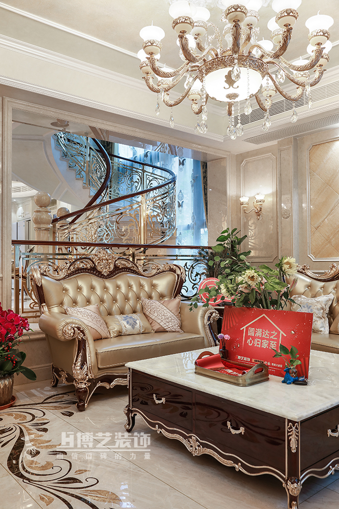 客廳以浪漫主義為主導,在大理石與線條打造的法式框架下于細節處表現巴洛克的精雕細琢,以華麗的軟裝,濃烈的色彩,精美的造型烘托高貴優雅的居家環境。