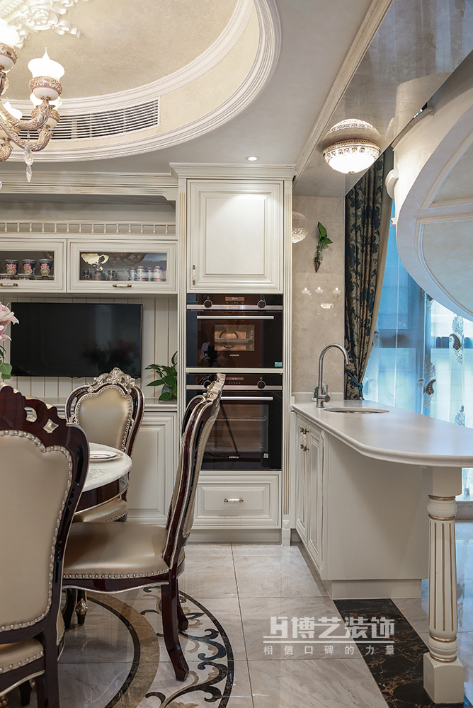 圓形的吊頂搭配經典的法式雕花,造型古樸的水晶燈,使整個空間看起來富含韻律感且大方典雅,奶白色的櫥柜為整個空間帶來柔美的氣質,水吧臺的設計與其他空間形成互通,在視野上得到拉伸。