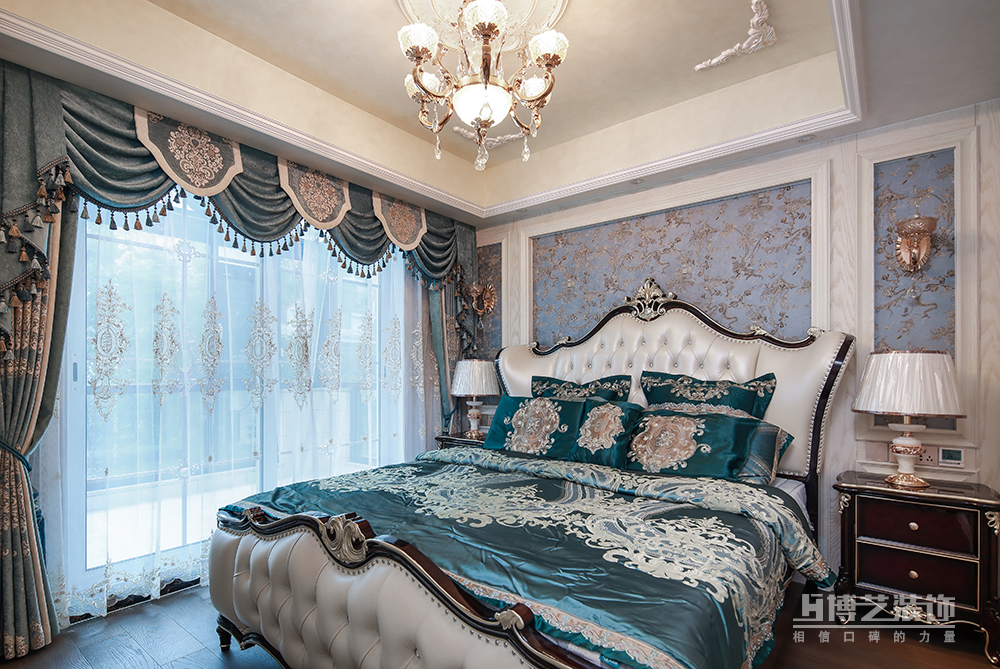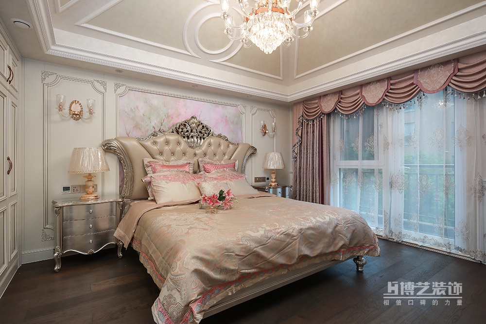 法式復古吊頂,華麗水晶燈,粉色窗簾將優雅、浪漫的因子復刻進這白色的空間里,雕花的法式大床讓臥室變得更加高雅,床頭泛著銀色的床頭柜更是增添了幾分華麗與時尚的氣息。