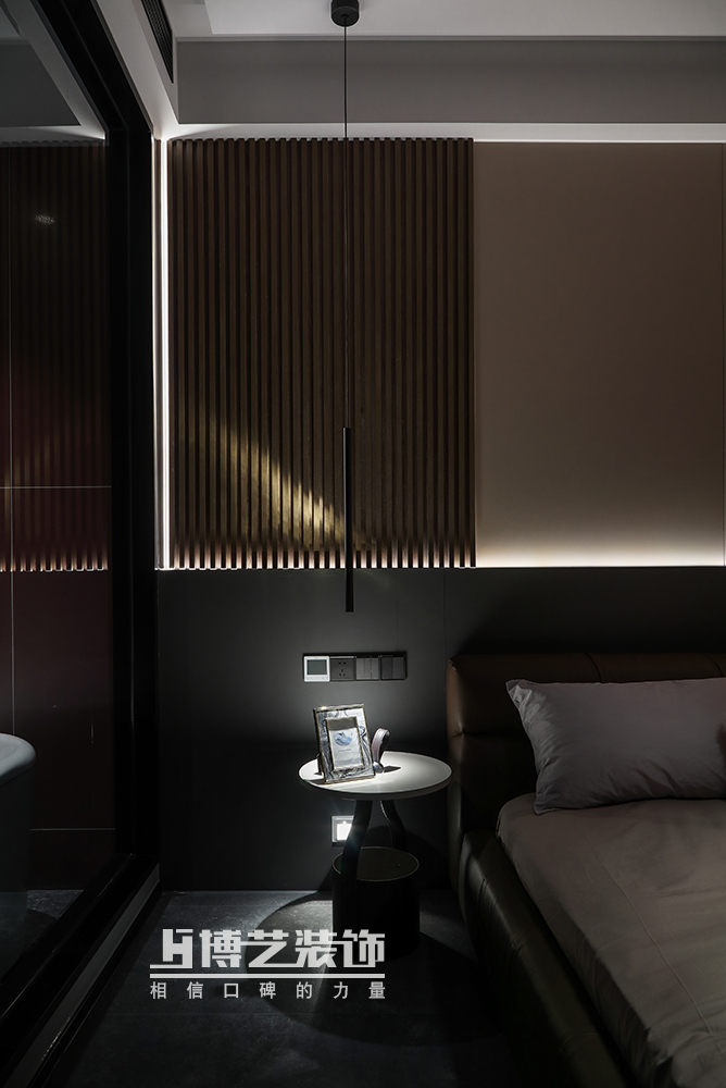 暗色調的臥室,自然地形成一個靜謐的場域,一盞日落燈暈染了溫柔的氛圍,這是為你準備的“盛宴”。