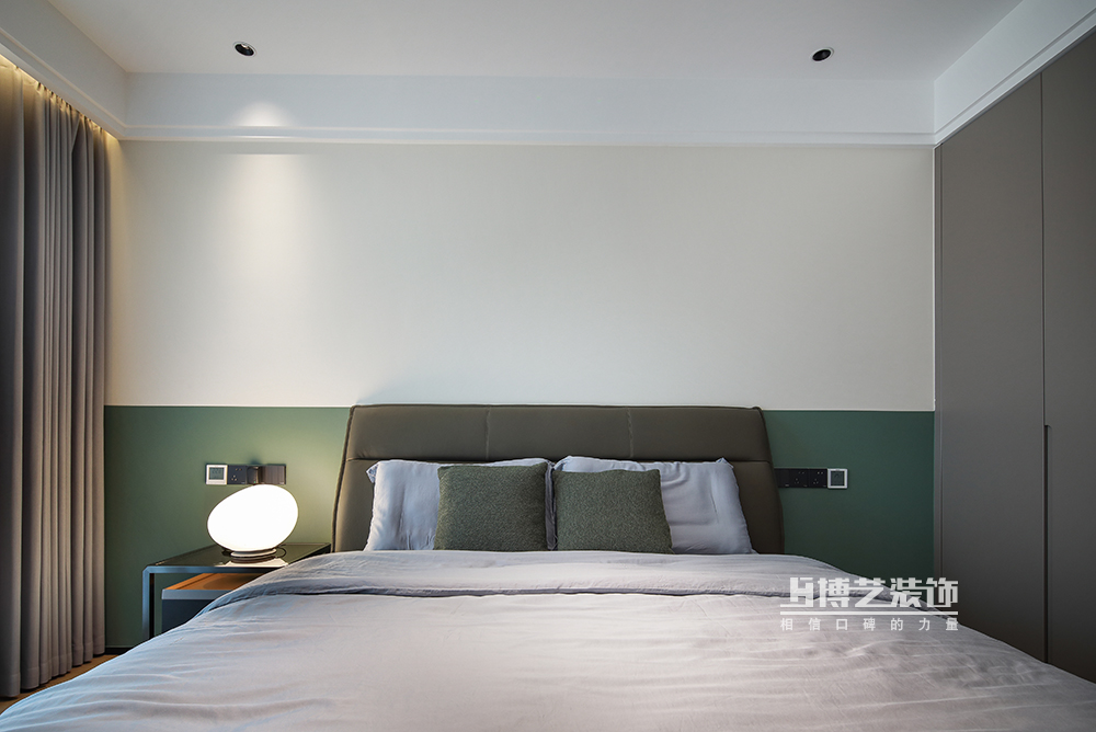 主臥保持整體極簡的風格,簡單的白色與墨綠沖撞,營造迷人的視覺沖突。