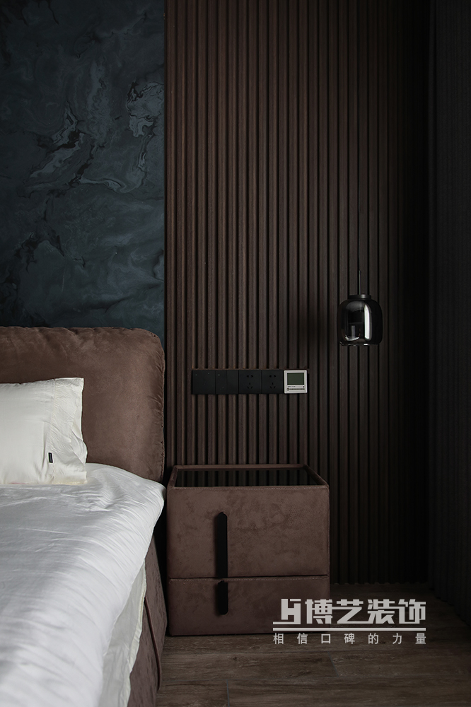 主臥的墻面以格柵搭配低度藍色護墻背景,摒棄掉主燈,以氛圍燈烘托營造靜謐安定的睡眠環境。