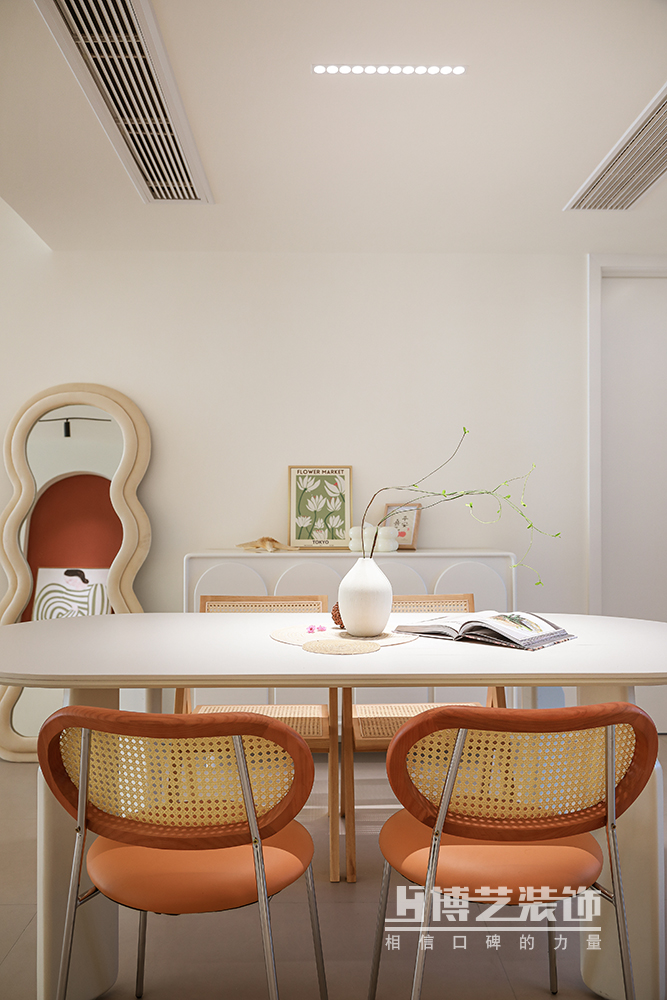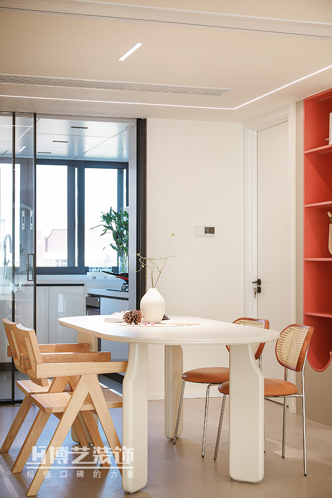 白色餐桌與藤編的木質椅讓簡約不簡單,旁邊紅色的置物柜是春日里突然閃現的花朵,翩然入境。