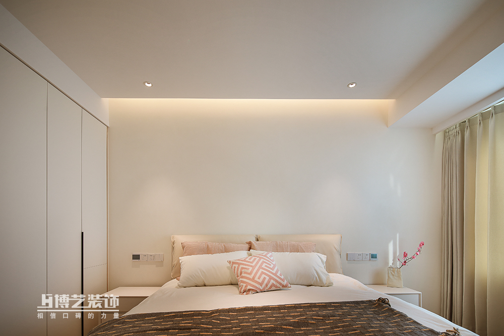 主臥采用無主燈設計,柔和不刺眼,氤氳的迷人氛圍舒適且安定,當洗去的疲憊,沉浸無暇好睡眠。