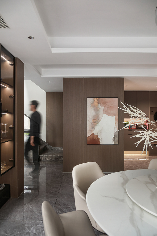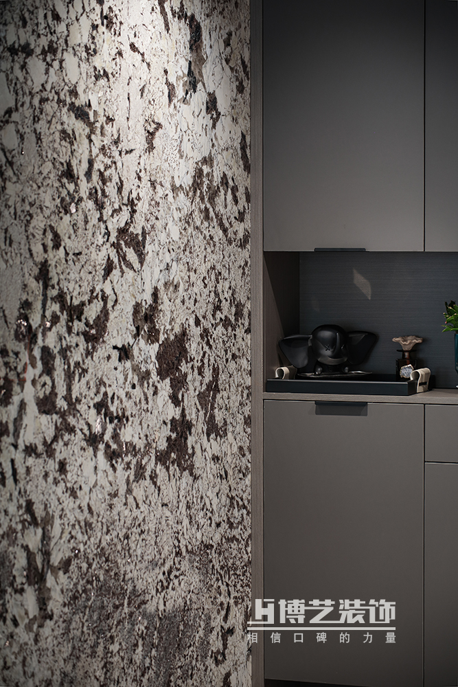推門而入,一整面大理石替代常規(guī)墻面,帶來(lái)自然相熟的氣息,相鄰一組多功能玄關(guān)柜滿足生活需求。冷與熱,剛與柔,生活與理想奇妙的融合與共生。