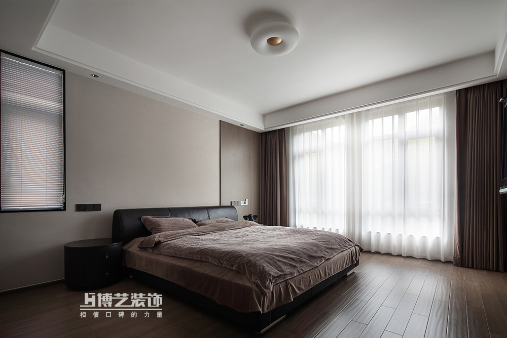 臥室采用不對(duì)稱的設(shè)計(jì),借原有的窗口與護(hù)墻制造有差別的視覺效果,暖咖色與黑色的搭配營(yíng)造出空間溫暖、穩(wěn)重的氛圍感,讓身體與心靈得到真正的放松。