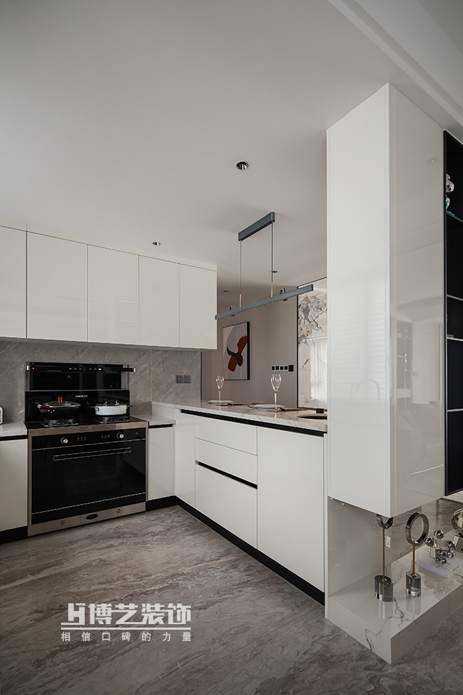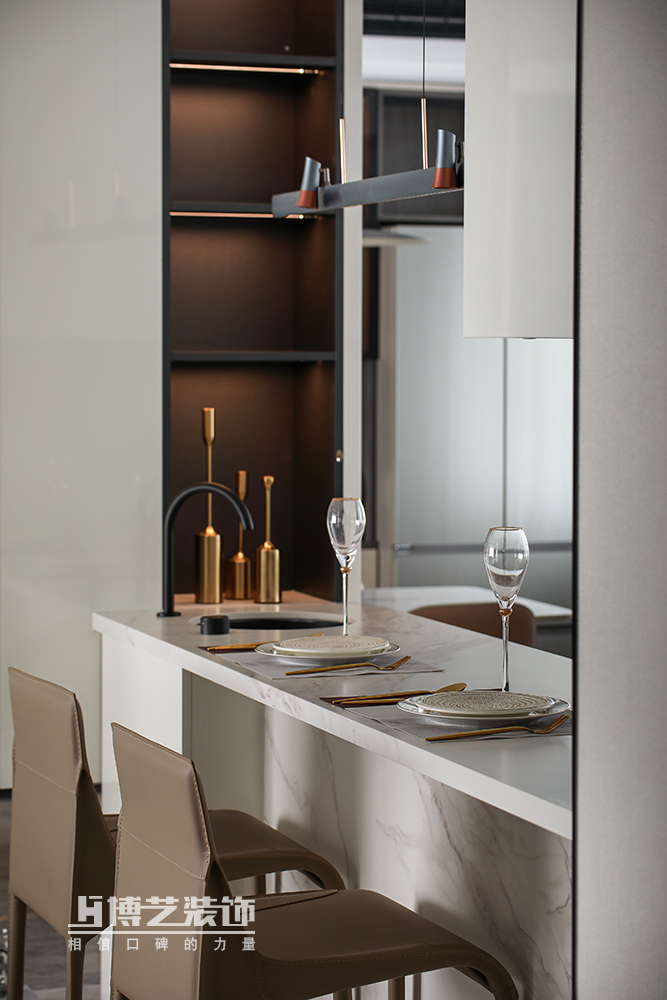 一邊的櫥柜抬高做水吧臺,就餐或操作皆宜;延伸的一邊做懸空柜,形成隔斷避免開門見底,同時不影響整體空間的通透性,方便日常收納。