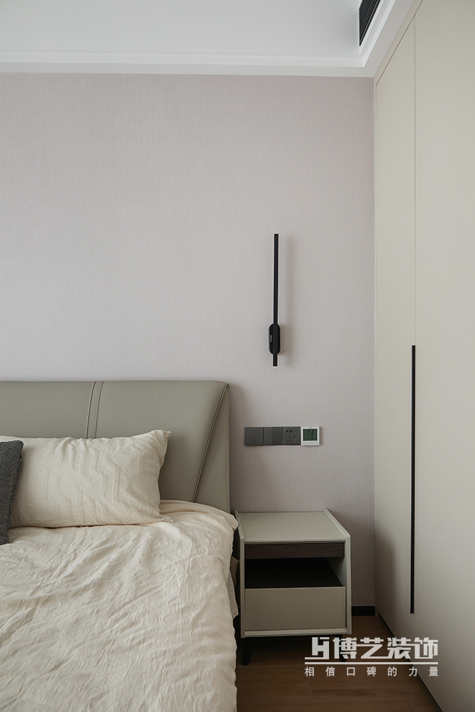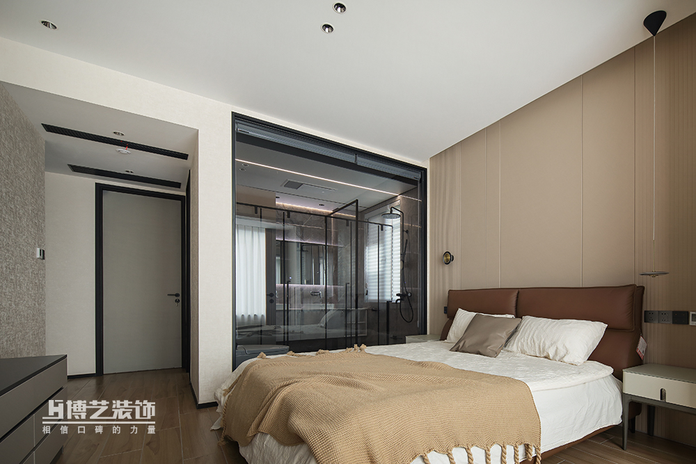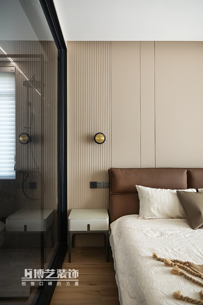 奶茶色的臥室空間,黑色沉穩帶來滿滿的安全感,深咖色的床靠與白色床品堆疊豐富空間層次感,舒適與溫暖,柔暖的環境進入深沉睡眠。