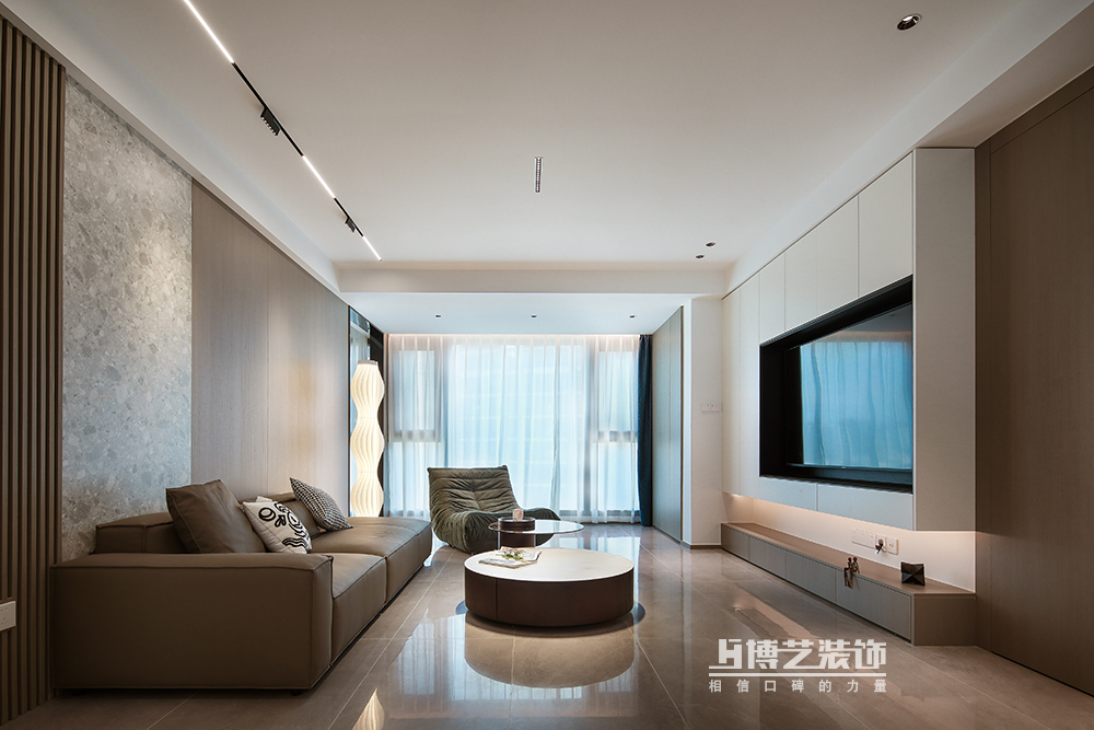 利用墻體打造的柜體滿足家居深度收納需求,電視柜用白色柜體打造點(diǎn)亮空間環(huán)境,制造視覺中心。沙發(fā)背景采用木飾面與水磨石的結(jié)合,拼貼的手法將時尚感拉滿。