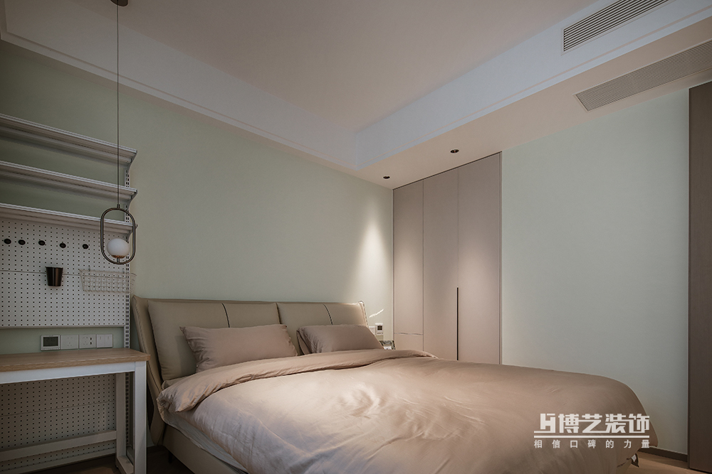 與客廳一致的柜體在設(shè)計(jì)上創(chuàng)造相呼應(yīng),大地色的色調(diào)富有層次感,視覺上不會有強(qiáng)烈的起伏,整個空間更柔和。