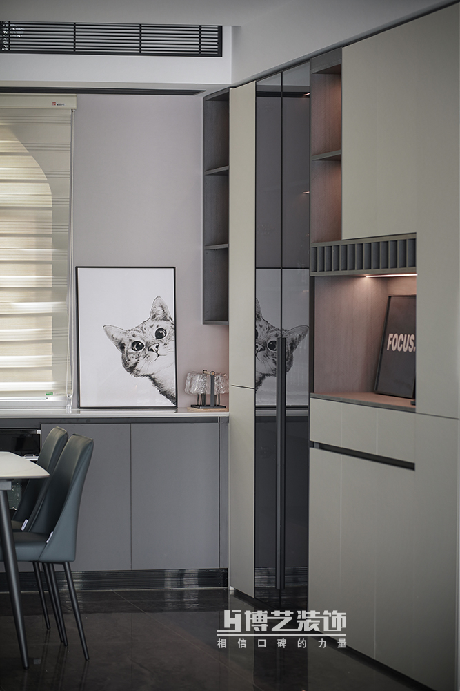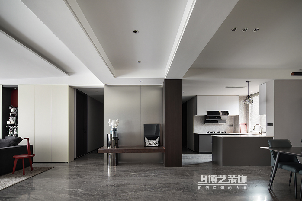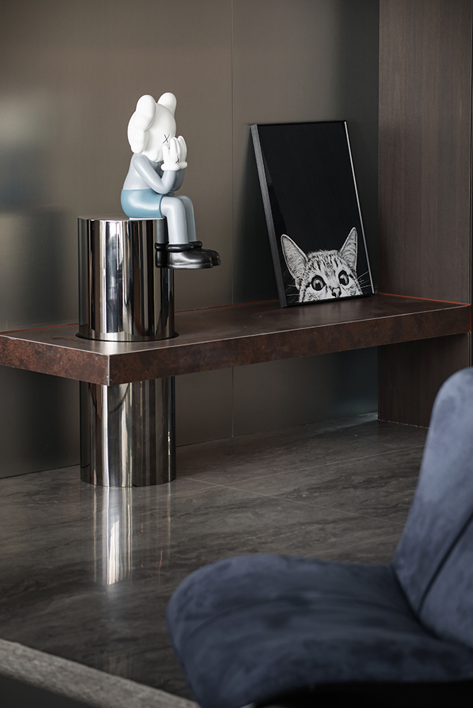得益于一梯一戶的優勢,把鞋柜安置于門廳,讓客餐廳部分更完整。玄關順勢利用柱子做入戶造景,打破傳統,給予開門的儀式感。Kaws網紅公仔與亮面不銹鋼的結合,精致又不失個性,別具一格的潮流風。