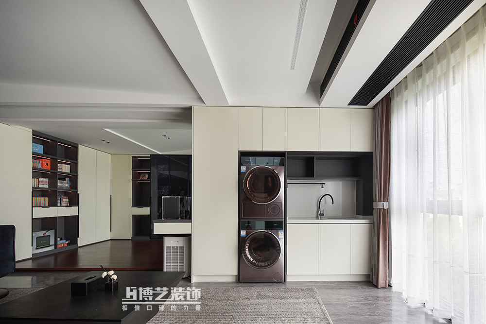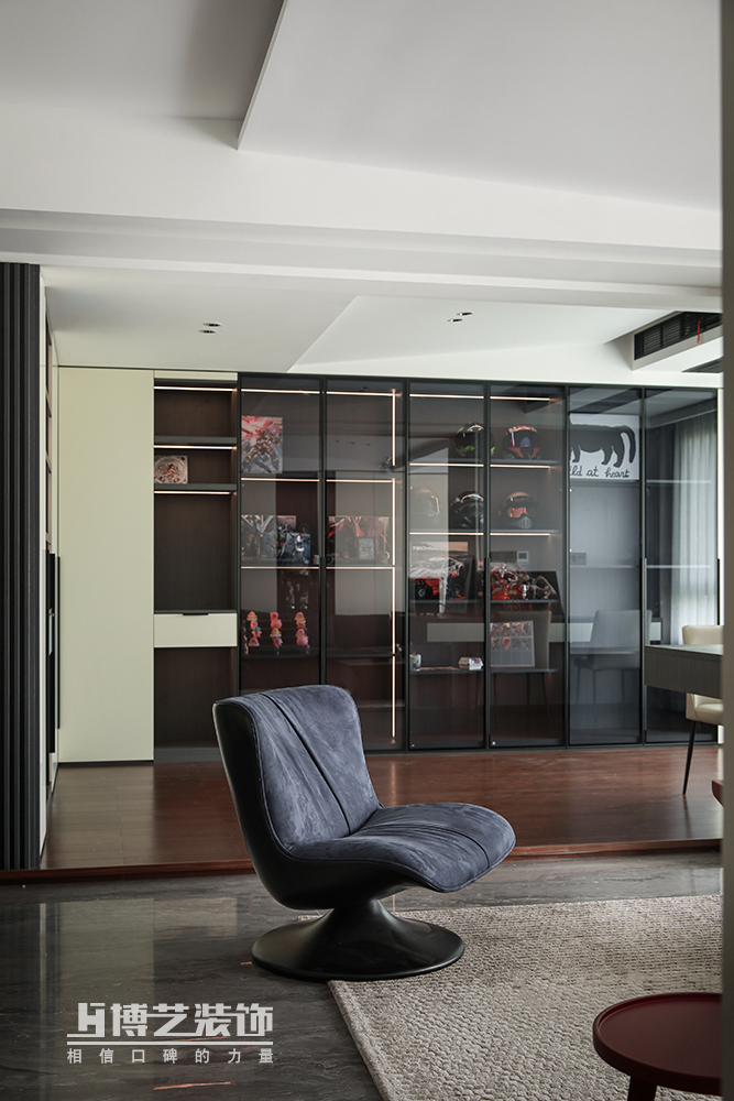 敞開式的書房可以與客廳合為一體,人多也不怕擁擠;未來ta也可以作為親子游戲的場地。地臺的設計與客廳形成一點落差把客廳與書房做出功能上的區分。L型的書柜是書本與業主“藏品”的歸屬地。