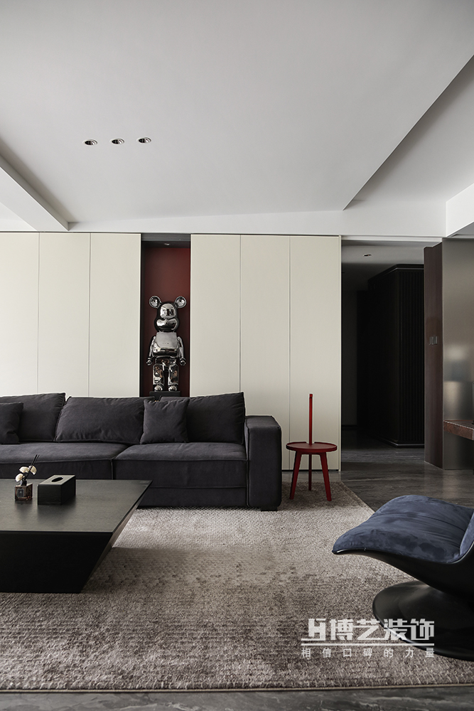 整體黑白灰的色調通過極簡的手法融合,再加上一點點復古的紅色,創造一個高級、舒適的居家環境。兩側的柜體兼具收納及生活功能,滿足生活上的需求。