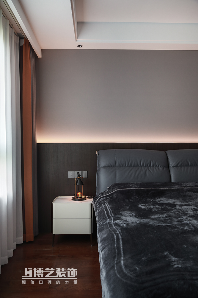 主臥依舊延續了極簡的基調,暖灰色的空間點綴深藍色的床靠,低飽和的色調有種莫名的治愈力,暗藏的燈光帶來高級的氛圍感,讓煩躁的心瞬間歸于平靜,安心睡個好覺。
