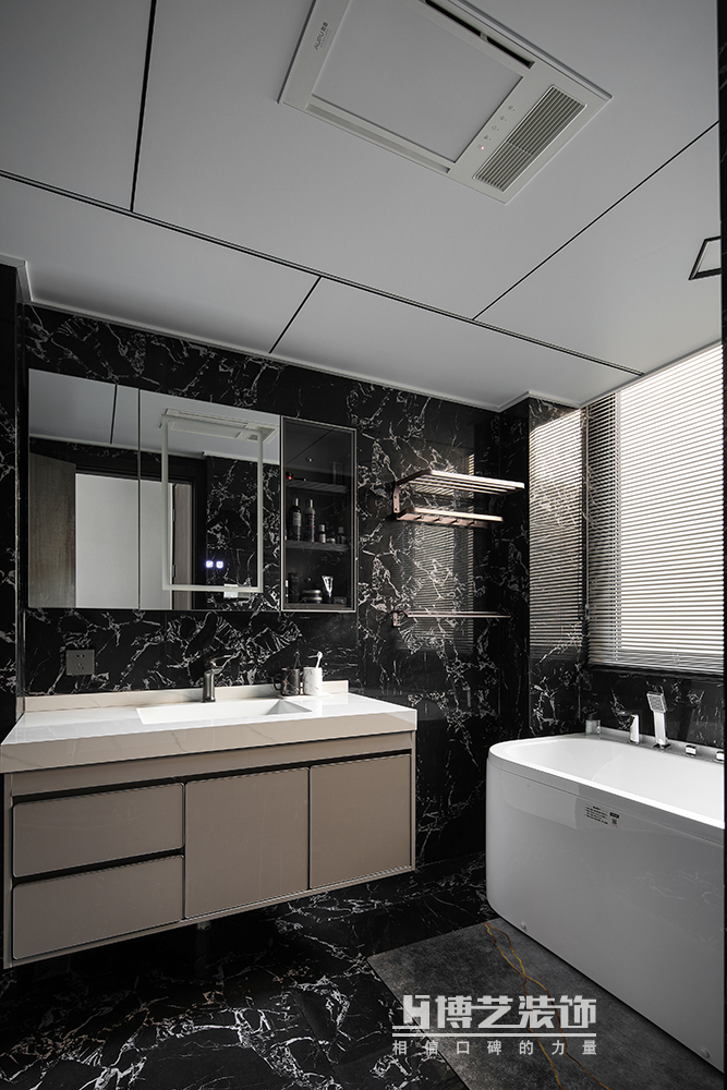 暗黑系的衛生間深邃、高級,白色張揚黑色收斂,極致的反差給空間帶來別致的感官,增加個性的體驗。