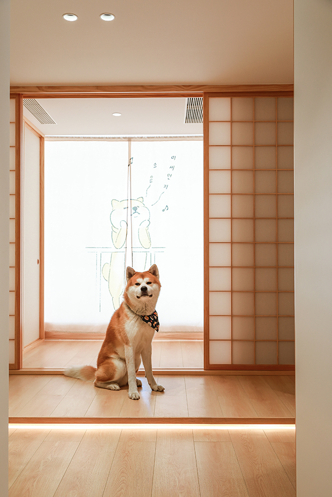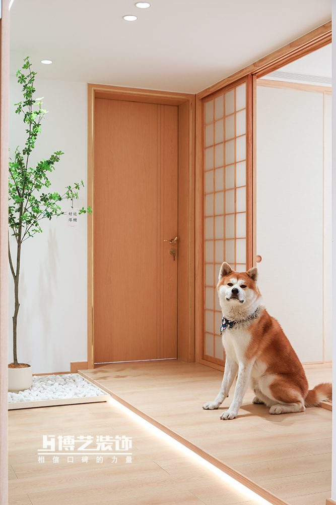 本案的業主是一對新婚夫妻,家中養了一只可愛的秋田犬。對于新家,他們希望不僅他們可以舒適的居住,狗狗也能在家中生活得自在、愜意。