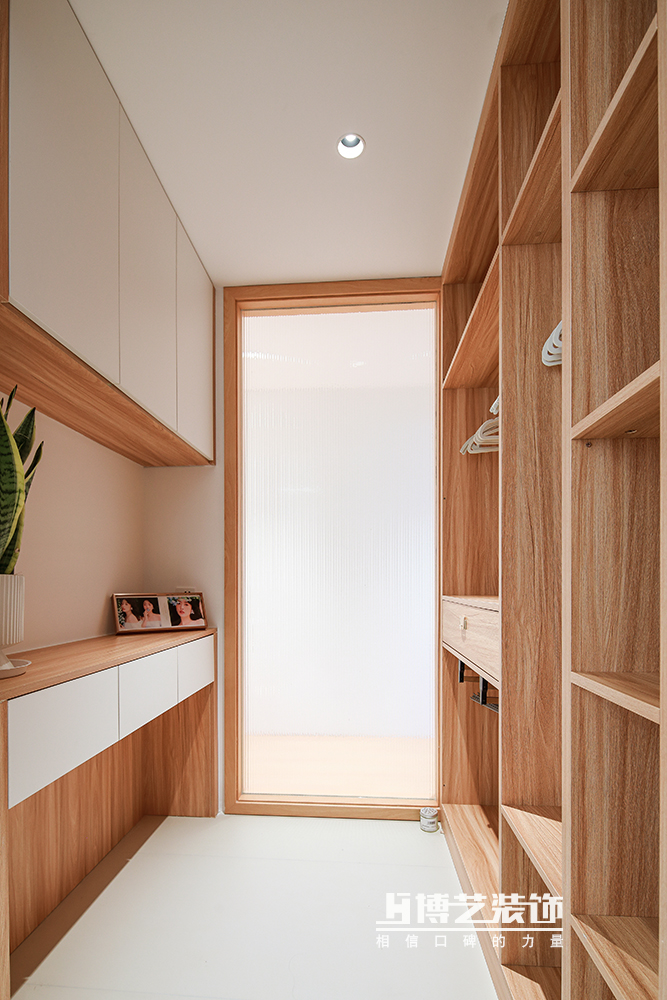 主臥室空間相對較小,以干凈清爽為主。衛生間以玻璃做隔斷,讓光線自然流入,超大的空間不僅生活功能齊全更是容納了衣帽間,讓收納更充裕。