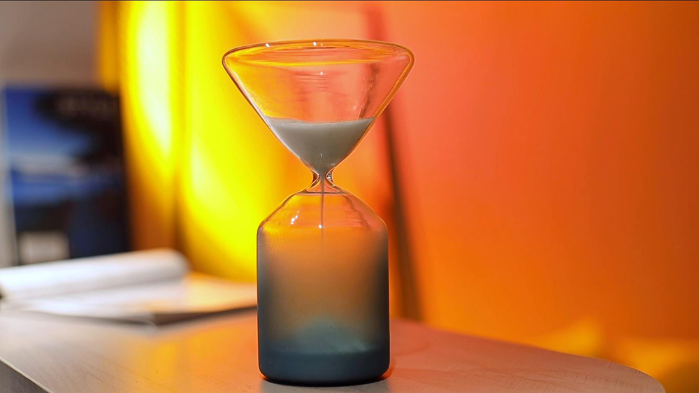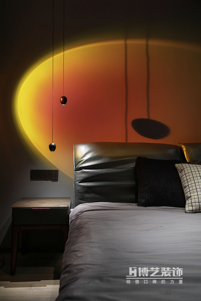 深灰的墻面,透光的玻璃磚再打上一盞落日燈,將臥室的情調(diào)拉滿,安靜的空間中,浪漫與溫柔隨感官擴大。