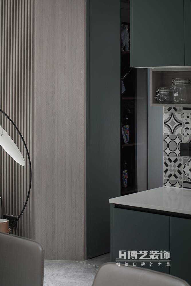 餐廚一體的設(shè)計讓空間更加寬敞,墨綠的柜體與拼花的墻面成為家中不可忽視的亮點,美好的用餐環(huán)境讓菜肴也變得更美味了。