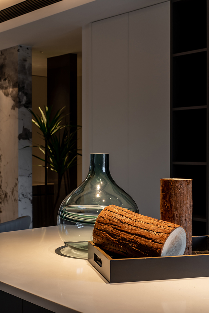 一進門就被大理石搭建的觀景玄關所吸引,玄關的設立,巧妙的化解了進門就見衛(wèi)生間的尷尬。黑白簡單干凈的配色,純粹又靈動,石材硬朗的線條搭配木質(zhì)溫潤的肌理,在點線間的燈光交叉映襯下,熠熠生輝。