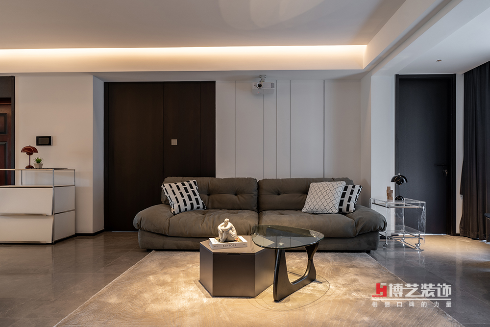 黑色與白色的大膽碰撞,呈現(xiàn)不一樣的客廳風情。尤其是木質(zhì)黑色電視背景墻,一下成為客廳的視覺中心,同時隱形門巧妙地隱藏其中,也指引著主人完成空間的轉換。