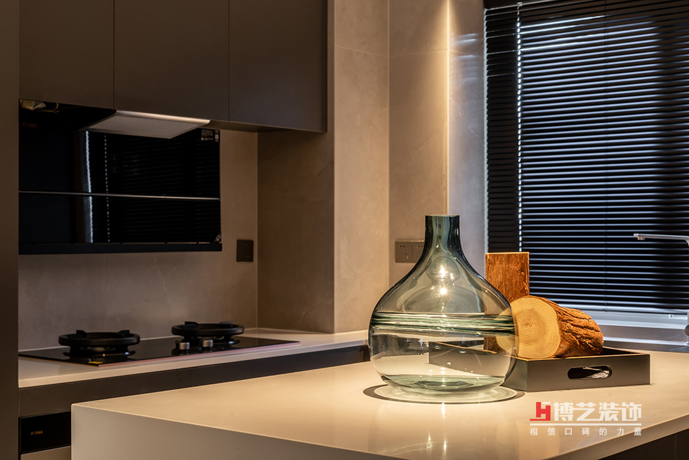 將封閉廚房改為開放式廚房,同時改變書房的進門方向,擴容廚房面積,中間增加島臺,形成洄游動線。從廚房到陽臺,我們沒有設置任何阻隔,讓光和風貫穿這個空間。我們在設計公區(qū)的時候盡可能的給家人之間創(chuàng)造多一些交叉空間,在不同的空間里看到彼此,多些互動的機會。