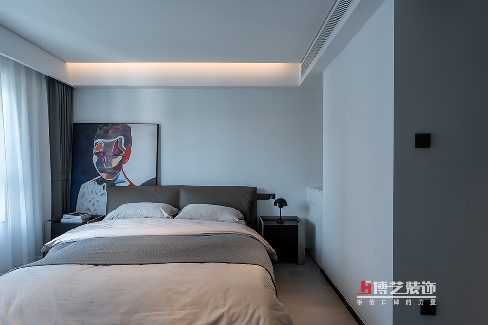 主臥跳脫強烈的黑白對比色彩,讓人一下放松療愈。清晨的光透過薄薄的紗,仿佛給主臥注入了一抹質(zhì)感的濾鏡,用自然的力量平息一整天的忙碌。