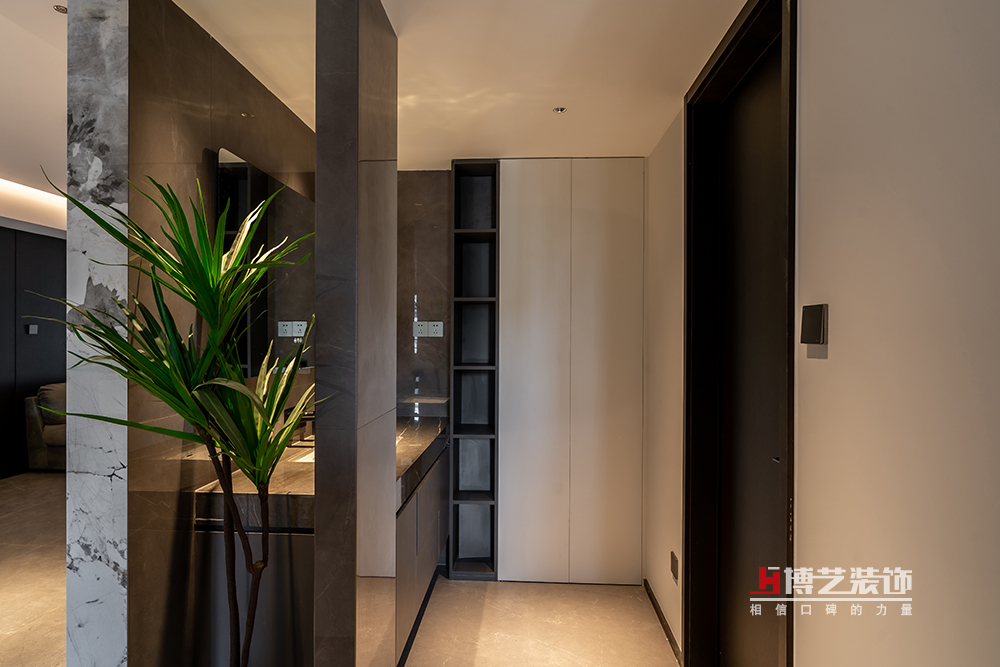 玄關背后巧妙地被利用起來,做了干濕分離,讓個玄關區(qū)域不僅成為整個房子的顏值擔當,又讓“干”和“濕”兩個極端在這個空間彼此包容合作。黑白的空間里用一葉綠意點綴,賦予剎那間的悠遠意境。